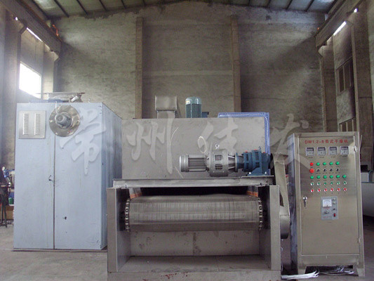 物料由加料器均勻地鋪在網(wǎng)帶上,網(wǎng)帶一般采用12-60目不銹鋼絲網(wǎng),由傳動裝置拖動在干燥機內(nèi)移動。干燥機由若干單元組成,每一單元熱風(fēng)獨立循環(huán),部分尾氣由專門濕風(fēng)機排出,廢氣由調(diào)節(jié)閥控制,熱氣由下往上或由上往下穿過鋪滿物料的網(wǎng)帶完成熱量與質(zhì)量傳遞的進程,帶走物料的水份。網(wǎng)帶緩慢移動,運行速度可根據(jù)物料溫度自動調(diào)節(jié),干燥后的成品連續(xù)落入收料器中。上下循環(huán)單元根據(jù)用戶需要可靈活配備,單元數(shù)量亦可根據(jù)需要選取。
